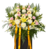 This condolence wreath features a balanced blend of pure white and soft pastel blooms — symbolizing comfort, unity, and eternal rest. The arrangement’s circular form reflects the continuity of love and remembrance, while the gentle hues bring a sense of calm to moments of grief.