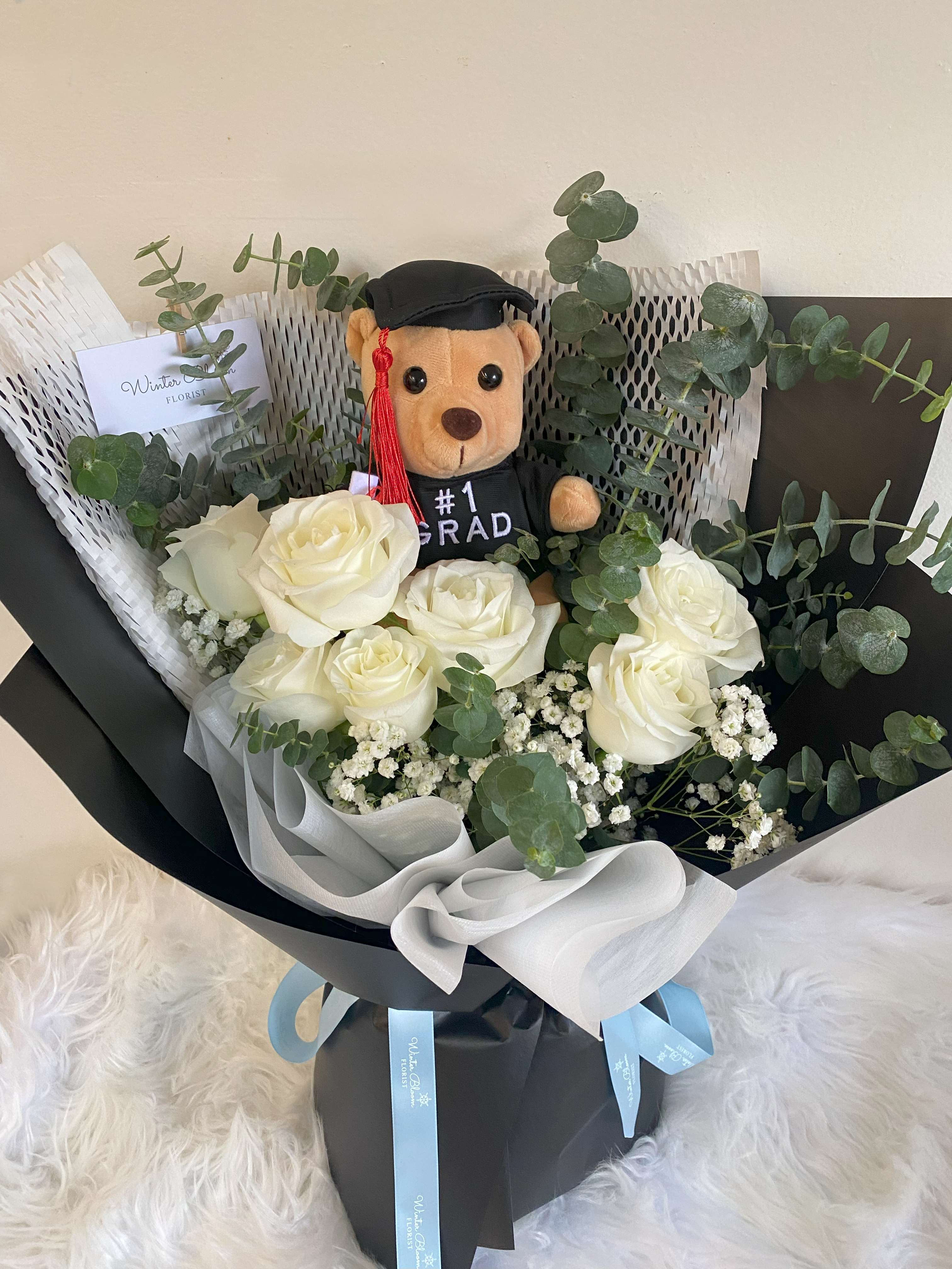 Roses. Eucalyptus. Baby’s Breath. Graduation Bear.