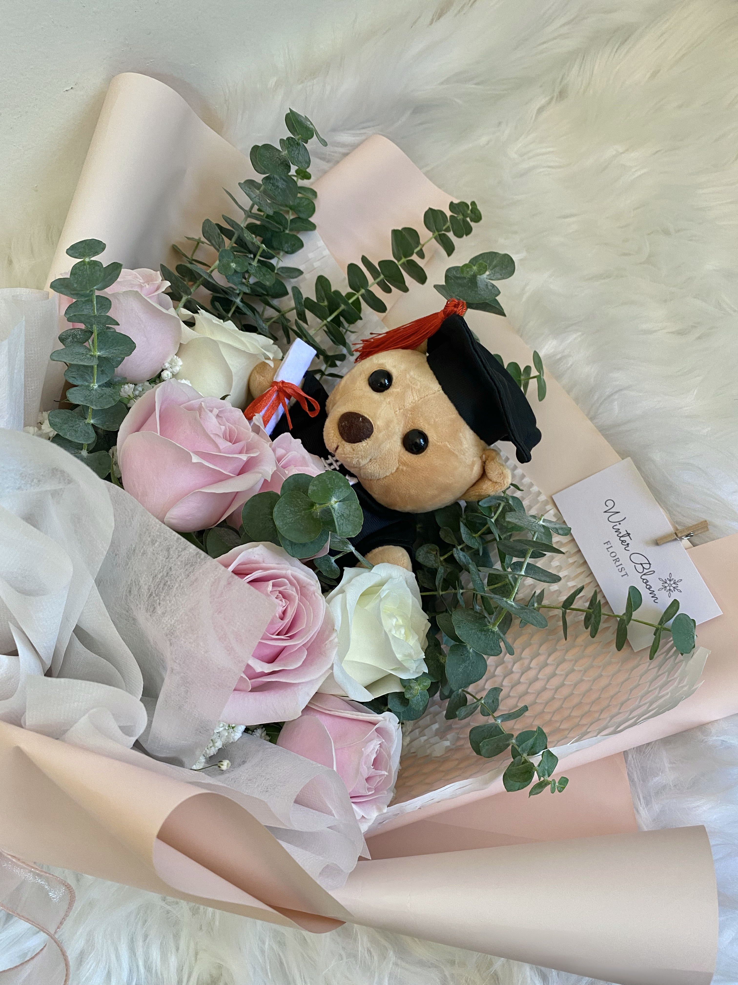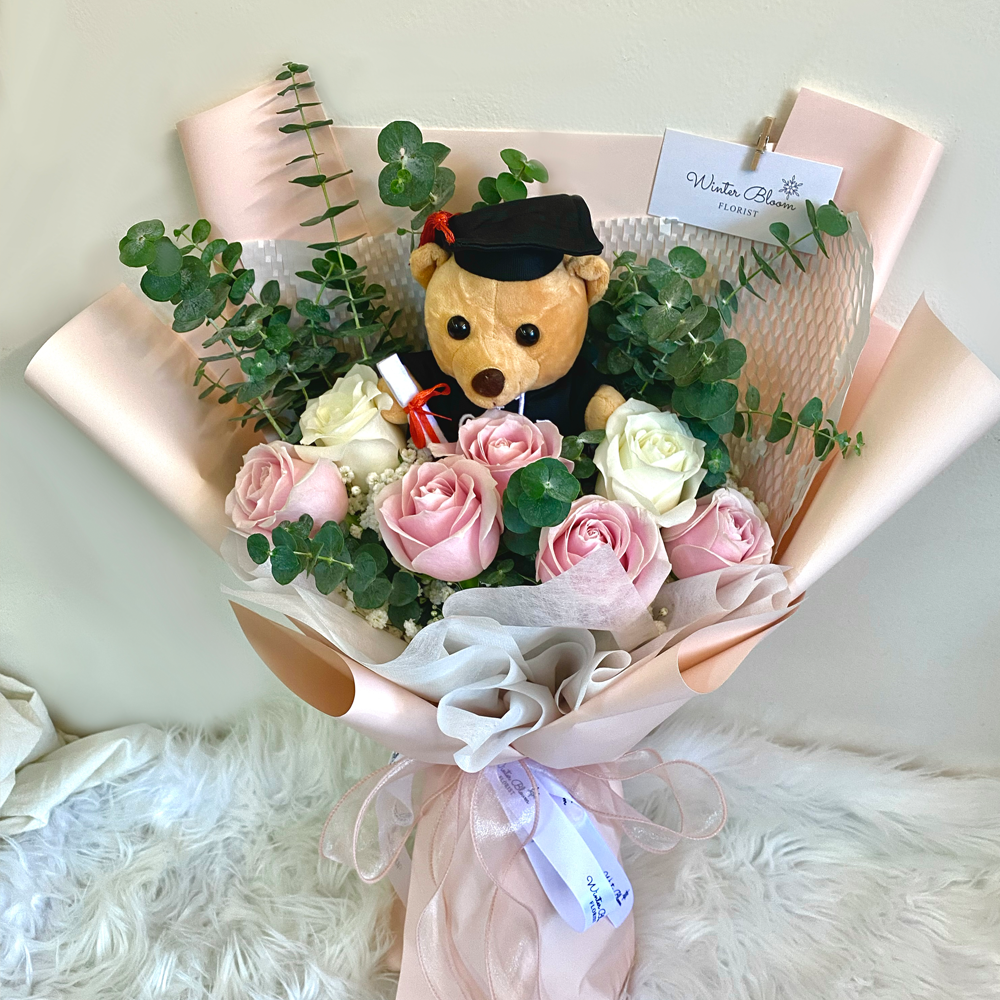 Roses. Eucalyptus. Baby’s Breath. Graduation Bear.